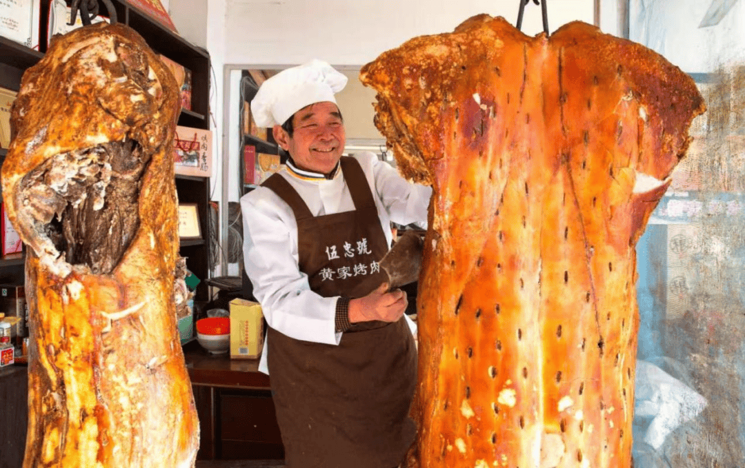 章丘绣惠镇黄家湾伍忠烤肉店位于绣惠街道中心大街,个体工商户,注册商标“伍忠黄家烤肉”,主营猪肉食品,经营者黄伍忠。清朝末年章丘县城黄家传人黄锡宪,小名小全子,传承祖上留传下来的烤制技艺经营黄家烤肉,在章丘县衙门前买下店铺,辛寨好友辛铸九为其题字号“全盛号”,专门经营黄家烤肉生意。旧军孟家经常拿“全盛号”黄家烤肉馈赠亲友、宴请宾客,相传还进贡皇宫。黄锡宪育有三子共同打理“全盛号”,1956年公私合营“全盛号”黄家烤肉并入了当地肉联厂。老二黄荫柏之子黄伍忠熟练地掌握了黄家烤肉全部的制作技术,1978年改革开放黄伍忠开始了自己的烤肉生涯,后来在绣惠中心大街开设店铺“伍忠号黄家烤肉正宗楼”,专门销售黄家烤肉至今。2019年被认定为“章丘老字号”,2021年被认定为“济南老字号”。