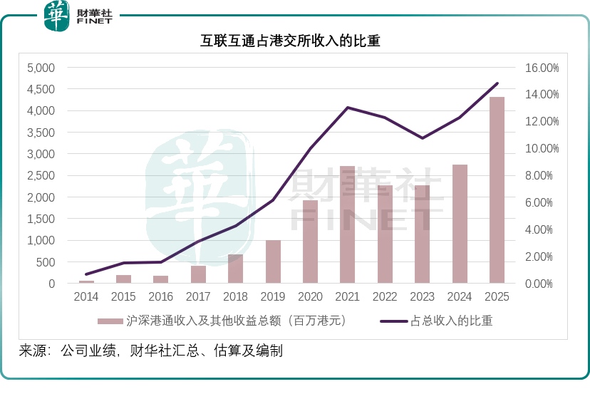 2025年沪深港通2025年全年收入同比增长57.33%,至43.17亿港元,占港交所总收入的比重由2024年的12.26%进一步上升至14.80%。