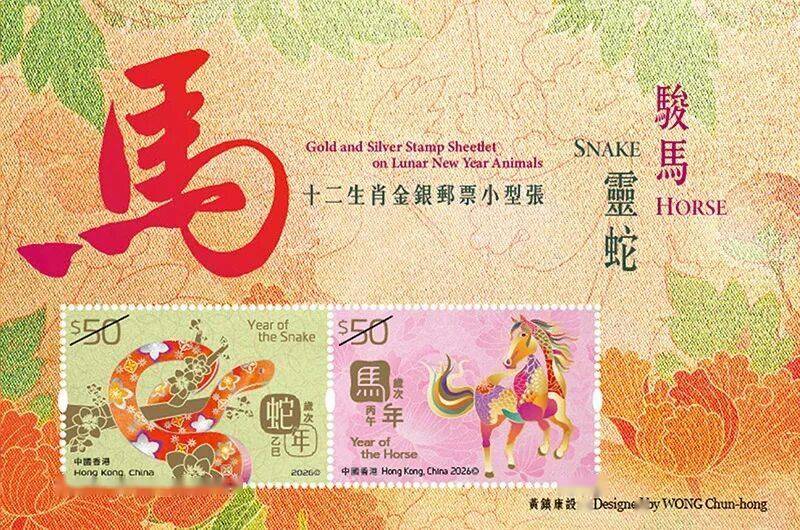 巳蛇辞旧岁,午马迎新春。香港邮政将特别发行以「灵蛇骏马」为题的十二生肖金银邮票小型张,传递佳节的美好祝愿。生肖邮票上的灵蛇与骏马分别以银箔和22K金箔烫压点缀,金辉银彩,洋溢喜庆华贵之气,更为新春佳节增添祥瑞。