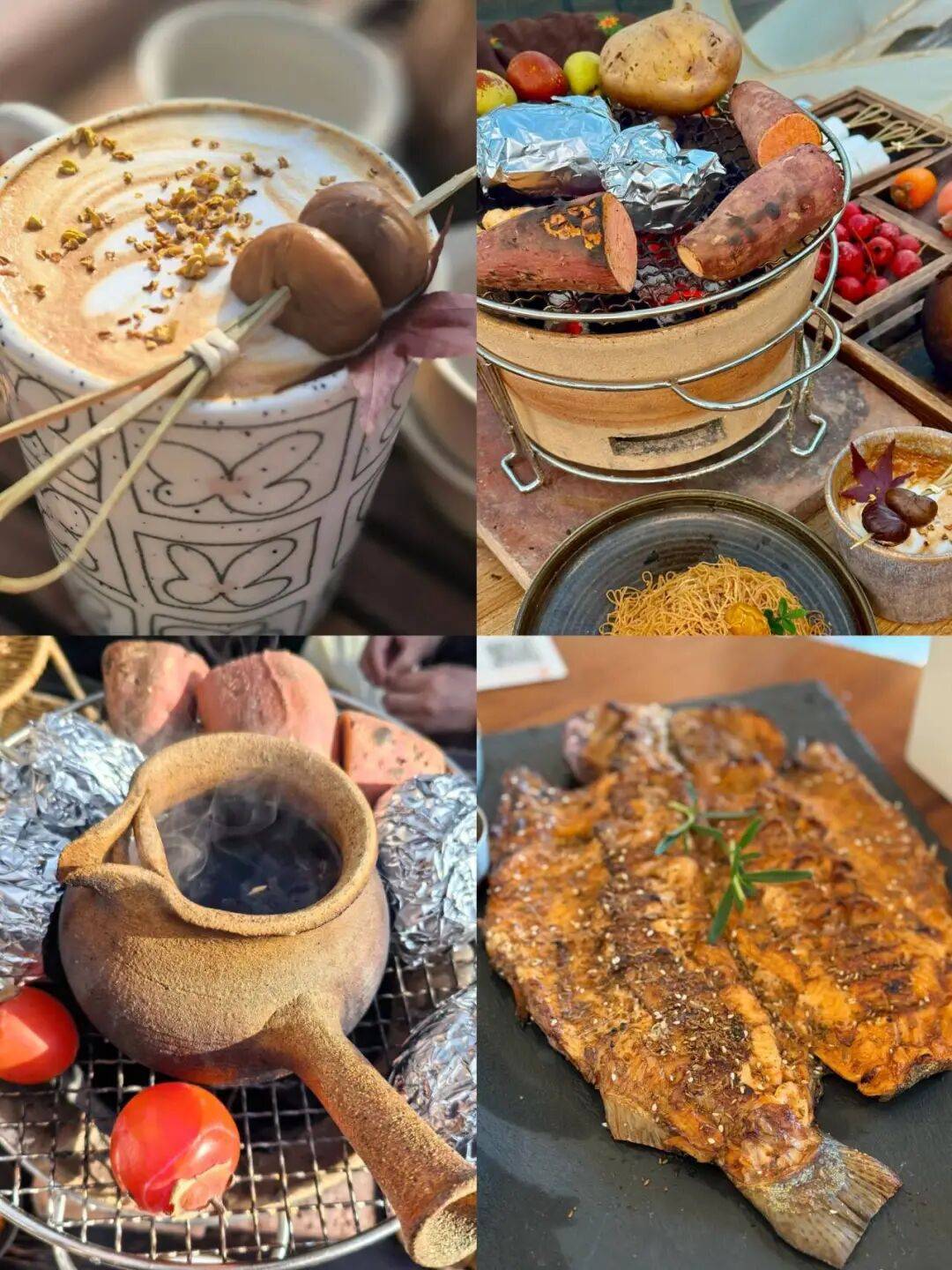 或者体验围炉煮茶,板栗、柿子、年糕,再煮一壶茶,和家人们享受慵懒的午后时光,真是很治愈。小朋友们更没闲着,可以参加手工活动,用栗子壳制作小挂饰。