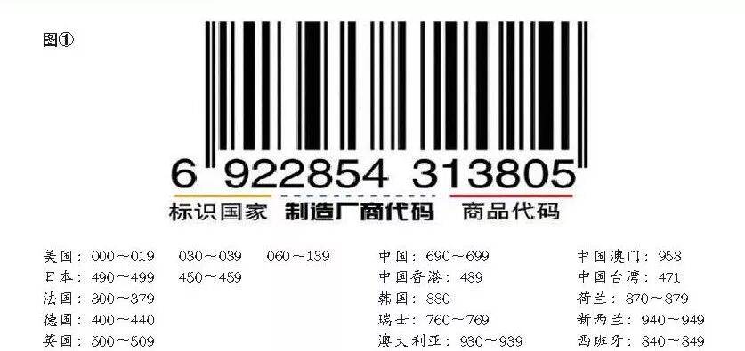 用来标识国家或地区的代码,赋码权在国际物品编码协会,比如690-699代表中国、471代表中国台湾、880代表韩国等。制造厂商代码: