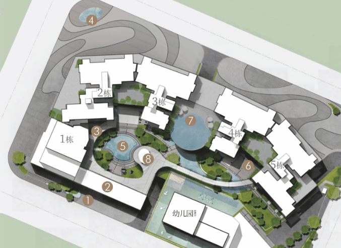 全区的弧线设计元素在此得到呼应,圆形及椭圆形的应用,修饰了由建筑边界造成的不规则场地形态,带给业主一处流畅的活动空间。