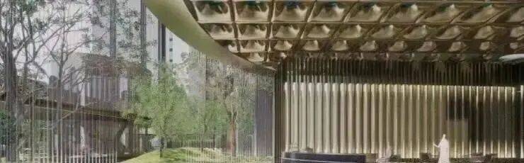 高层建筑立面的流光倾泻而下,在此处汇聚成一汪清池,捧着一方雕塑,像是卧在密林深处的碧蓝美玉。池水下行,延绵成溪,潺潺叠水拂过景石,可谓 “清泉石上流”,不仅丰富听觉享受,也增添自然之感。悬挑的小径漂浮于水面,与前景树木掩映成画。