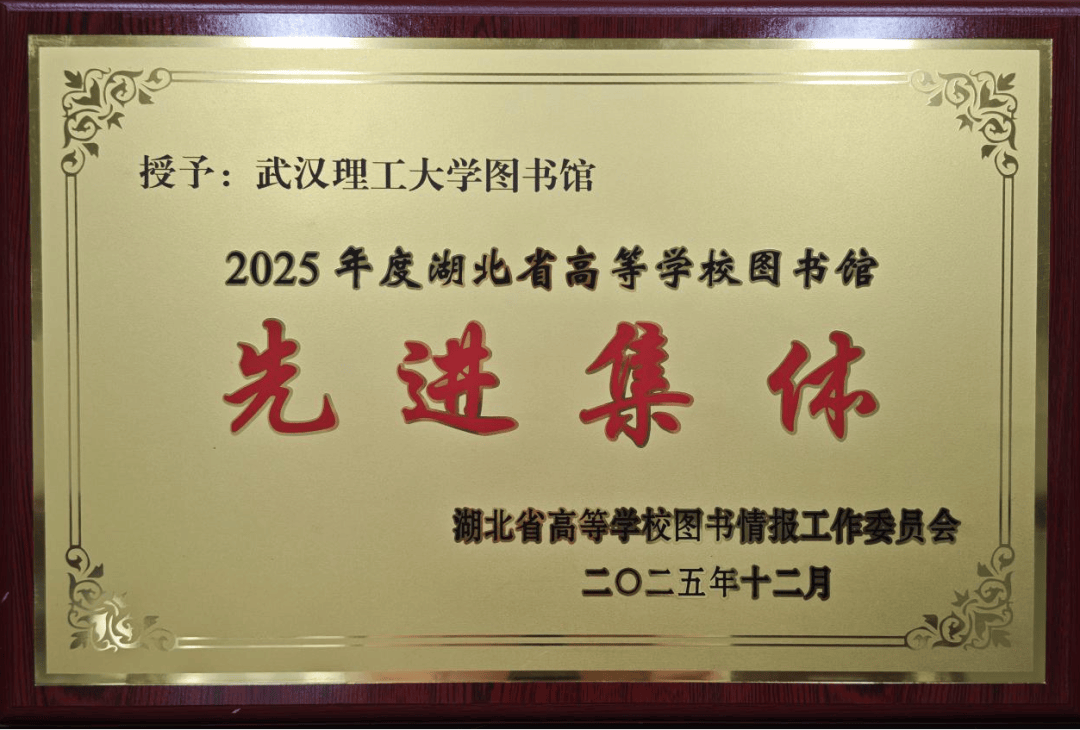 12月,在湖北省高校图书情报工作委员会的年度评审中,图书馆被评为2025年度湖北省高等学校图书馆先进集体,这是对我馆服务理念、管理水平与团队协作能力的高度认可。
