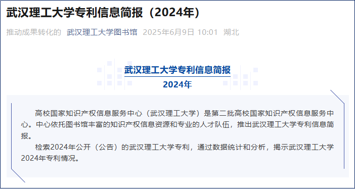 6月9日,图书馆发布2024年武汉理工大学专利信息简报。这不仅是一份学术地图,也为读者的创新探索标注了前沿坐标和可行路径。