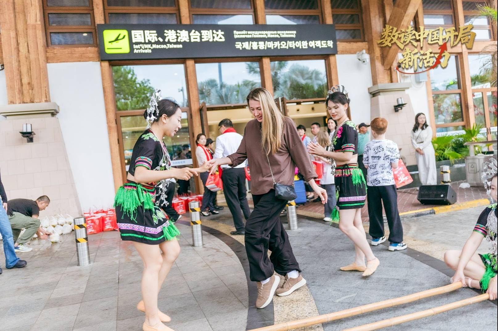 2月17日7时许,一架搭载超200名旅客、自俄罗斯喀山飞来的SU862航班平稳降落在三亚凤凰国际机场。机场到达厅内,海南本土乐队“奔内热”奏响欢快旋律,竹竿舞等富有民族风情的歌舞表演轮番登场。三亚还为抵达旅客准备了融入本地文化元素的新春礼品,将海南地域特色巧妙融入迎新场景之中。