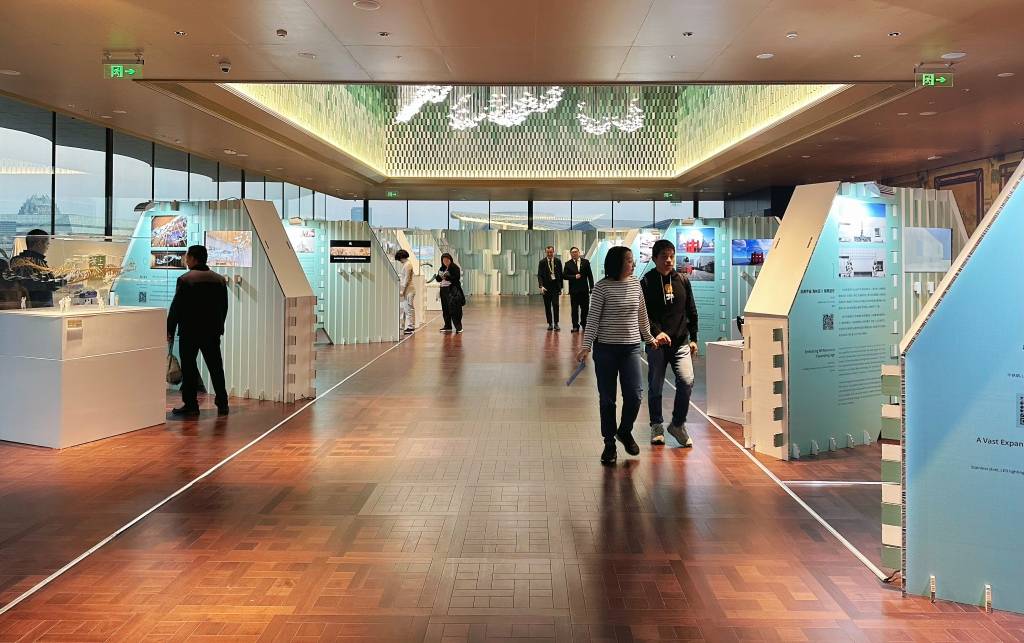 一楼中央开幕式大厅中庭天窗下与一楼东北角书香咖啡区上空是两处悬吊装置点位。美国艺术家小林基普设计了《永远的树》,一棵盘旋在中庭空间内的树,代表着不同世界的融合;盛姗姗工作室设计的《东方圆舞曲》,以“书画”为形体的玻璃装置展现出行书美学精神中逍遥自在的个体表达、形意并重的中和创作观念;上海米丘环境艺术设计有限公司设计了的《竹书纪年·夸父女娲后裔》,运用中国传统的材料工艺,如竹、瓷、金等,将远古神话场景进行具象和抽象的结合,从某个特定的角度观看作品,还能看到“后羿射日”的形象。