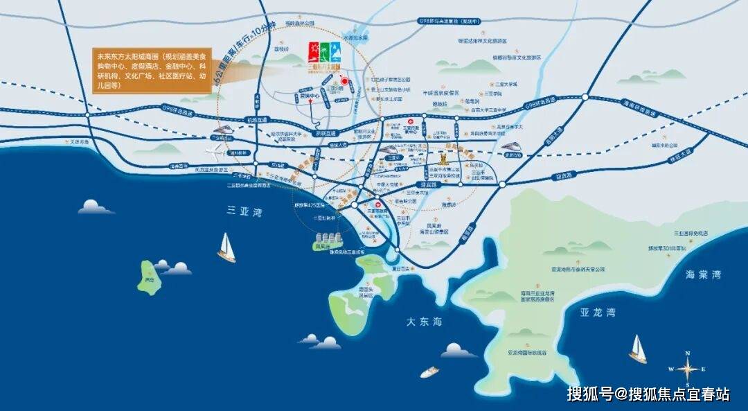 三亚·东方太阳城,西卧山顶公园,东拥三亚河(槟榔河),近享水源池水库、荔枝岭生态景观,面朝三亚主城区、三亚湾等,以山河为靠,以繁华为景,打造天赋上境栖居地。