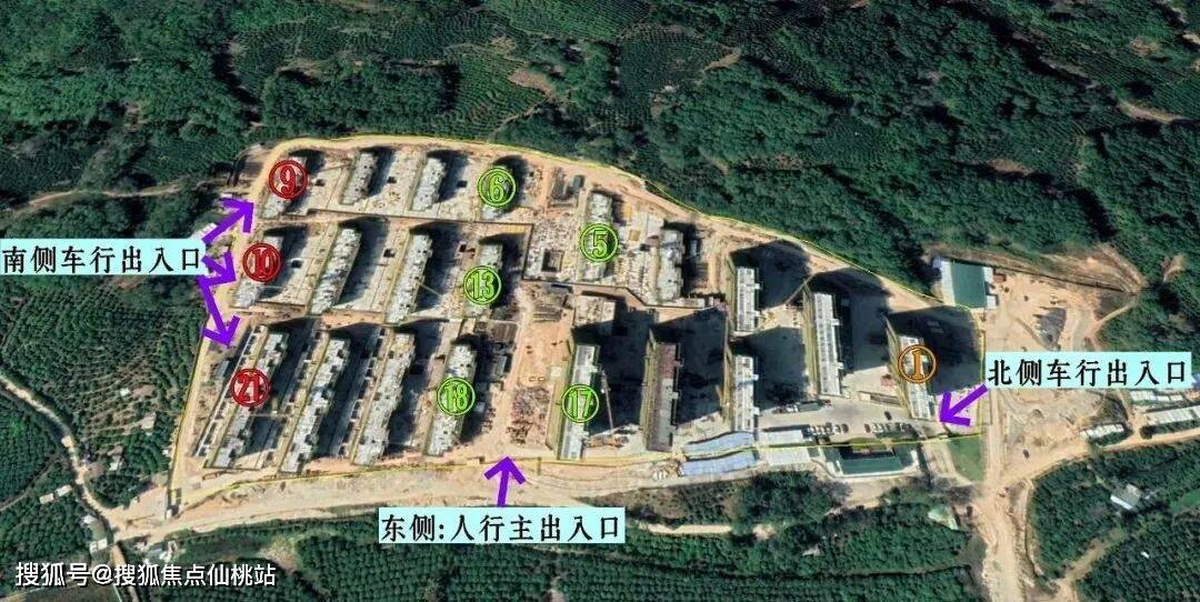 『东方太阳城·山河苑』项目:在东侧居中处设计为仅供人行的主出入口;北侧1号楼下,设计有地下车库出入口;南侧9号、10号、21号楼的楼下,设计有地下车库出入口。