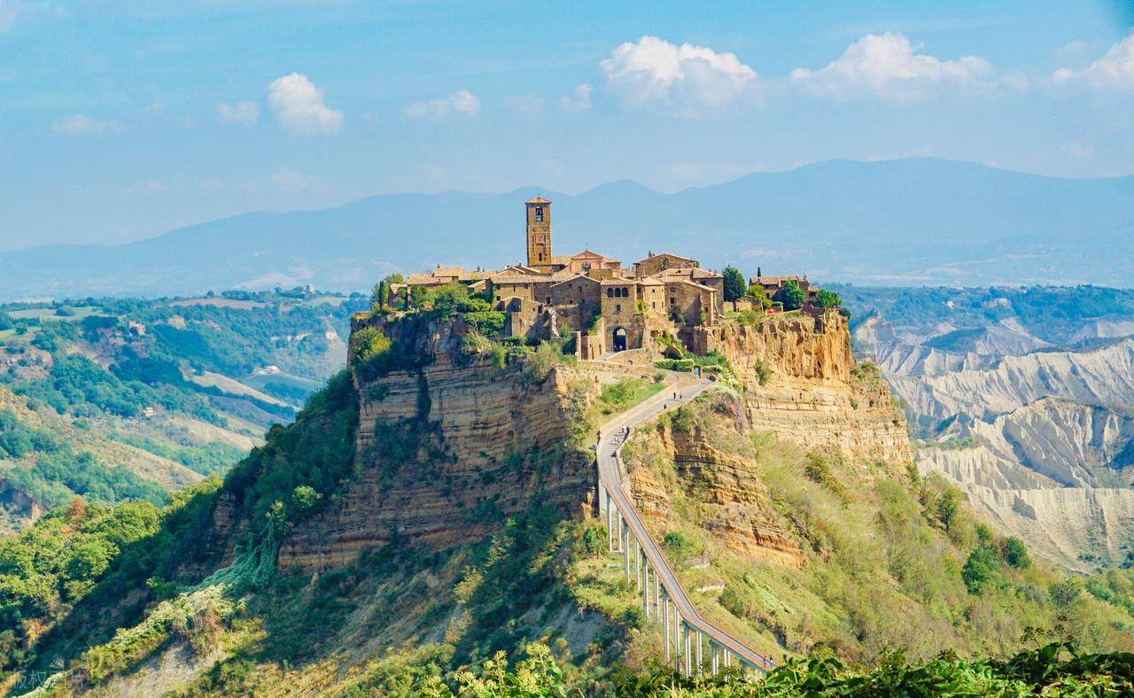 1. 奇维塔·迪·巴尼奥雷焦(Civita di Bagnoregio):正在消失的天空之城。由于地质侵蚀,它被列入“全球100处濒危遗址”。