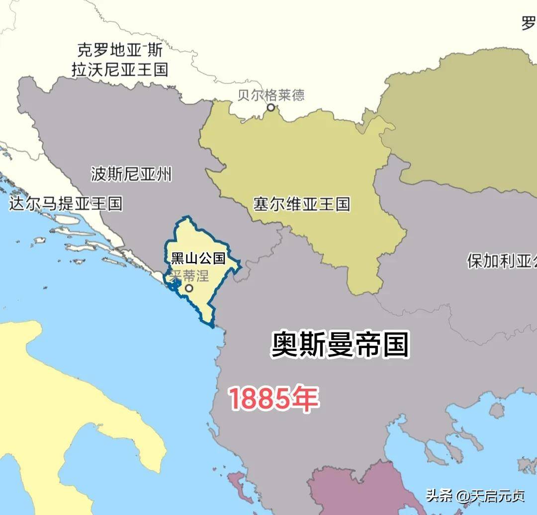 1875年,波黑起义爆发,黑山与塞尔维亚联手参战,同时俄国也对奥斯曼开战。1878年柏林会议确认黑山独立,并扩张了领土,还首次拥有了出海口。1912年,黑山升级为王国,并参加了两次巴尔干战争,版图进一步扩大。