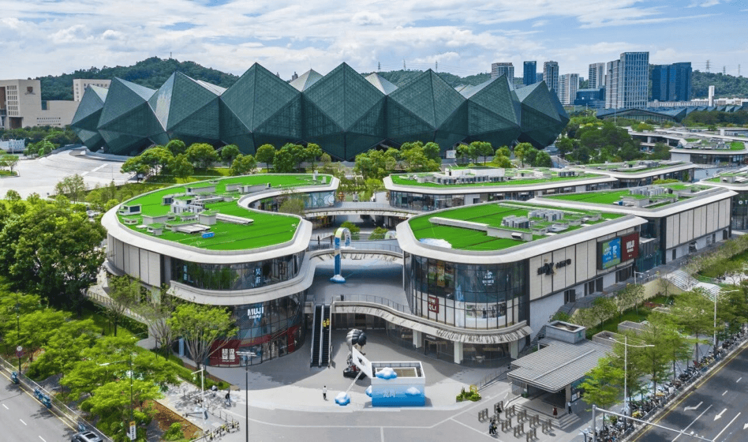 深圳大运天地无缝连接深圳大运中心,是位于龙岗区的创新型商业综合体,融合自然生态与现代商业。项目占地52万平方米,绿化率达93%,以“可呼吸开放式商业街区”为概念,将商场建在公园里,湖水、绿植与建筑相映成趣。这里不仅有近200家品牌,涵盖餐饮、运动、潮流服饰等业态,还饲养梅花鹿、黑天鹅等动物,打造宠物公园、环湖步道等生态空间。