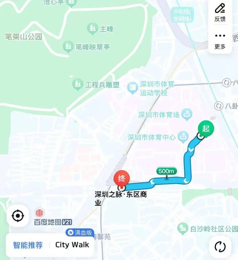 从深圳体育中心商业配套ALIVAL PARK到深圳之脉地下商业街步行不足10分钟,图源:百度地图