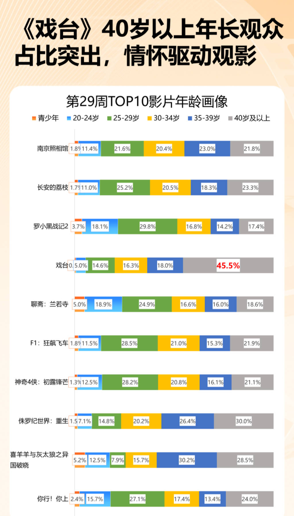 陈佩斯主演的《戏台》凭借浓郁戏曲元素与荒诞喜剧风格,成功吸引40岁以上、对传统艺术有感情的中老年观众,其票房热点高度集中于北京、天津,两地贡献超六成票房,甚至出现老年观众组团包场的“怀旧社交观影”现象,成为暑期档一匹不容忽视的黑马。