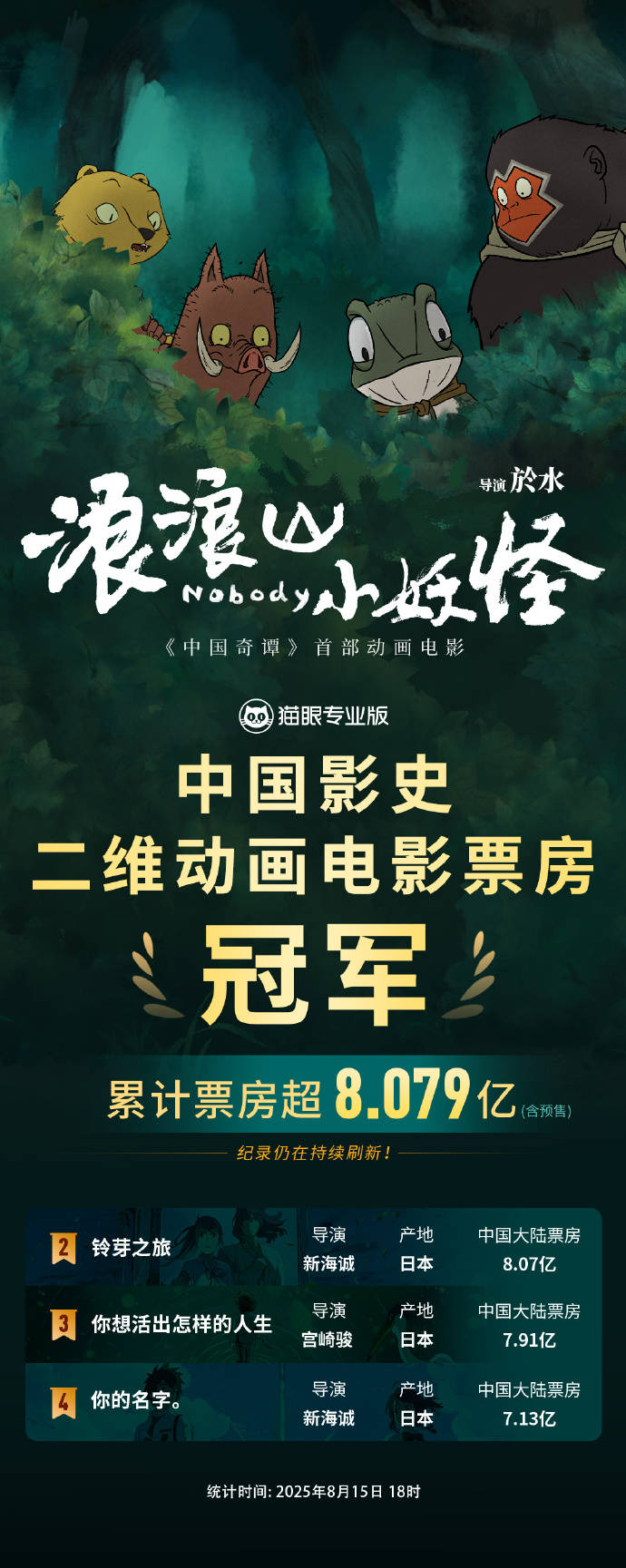 与此同时,二维动画在3D主导的市场中异军突起。《浪浪山小妖怪》改编自《中国奇谭》,凭借独特的东方美学风格和“打工人”视角的职场共鸣,拿下17.19亿元票房,刷新中国影史二维动画最高纪录;《罗小黑战记2》则以8.7分的豆瓣评分成为2025年院线电影最高分作品,在日本上映三天票房即破一亿日元。在《哪吒2》主动放弃报名之后,《罗小黑战记2》作为唯一代表中国内地的动画作品,成功入围第98届奥斯卡最佳动画长片奖资格名单。