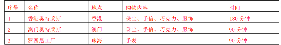 【香港奧特萊斯】(约120分钟)店鋪主营国际品牌珠宝、名包、名表、品牌香水等,每月都有不同的国際名牌推出超级优惠活动,客人可在该店自由选购,超级优惠活动的所有精品 ,感受免税国际大都会的购物乐趣!