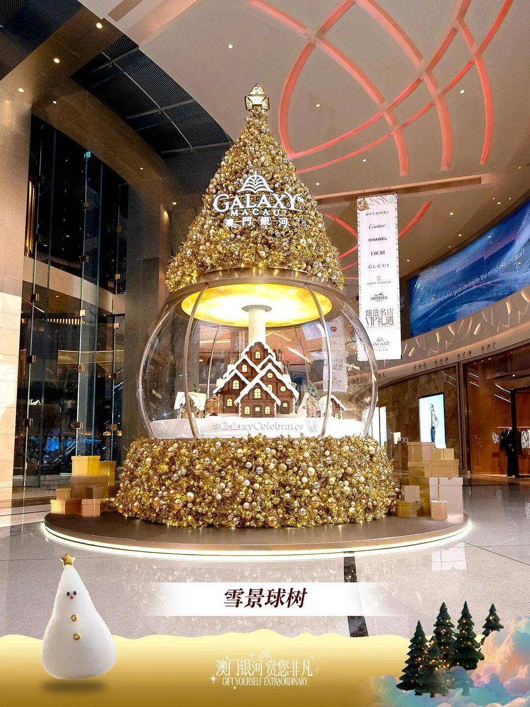 澳门银河整个度假城遍布耀目灯饰,翡翠大堂7米高的巨型“雪景球树”,灯光、音乐与特效完美融合,光影交错间宛如闯入童话世界。