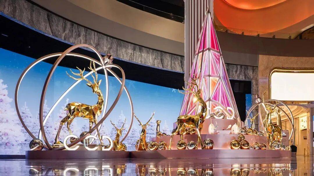 户外花园成为核心圣诞地标,金色驯鹿化身巨型八音盒随旋律缓缓转动,与星海草坪、粉金圣诞树和音符小精灵装饰,共同构筑起一个童话般的圣诞国度。反光玻璃幕墙,映出流动光影,变幻间尽显摩登美学。